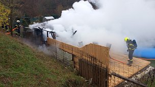 Jednotky hasičů z pěti stanic likvidují požár chaty na okraji Šlapanic.