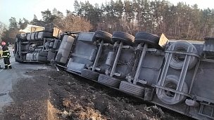 U obce Pernštejnské Jestřábí zasahují profesionální hasiči u převráceného kamionu. Událost se obešla bez zranění, hasiči provedli zajištění místa události a zamezili úniku provozních kapalin.