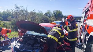 Na silnici I/53 poblíž Dobšic zasahují hasiči u nehody osobního vozu a autobusu. Z osobního vozu vyprostili jednoho člověka.